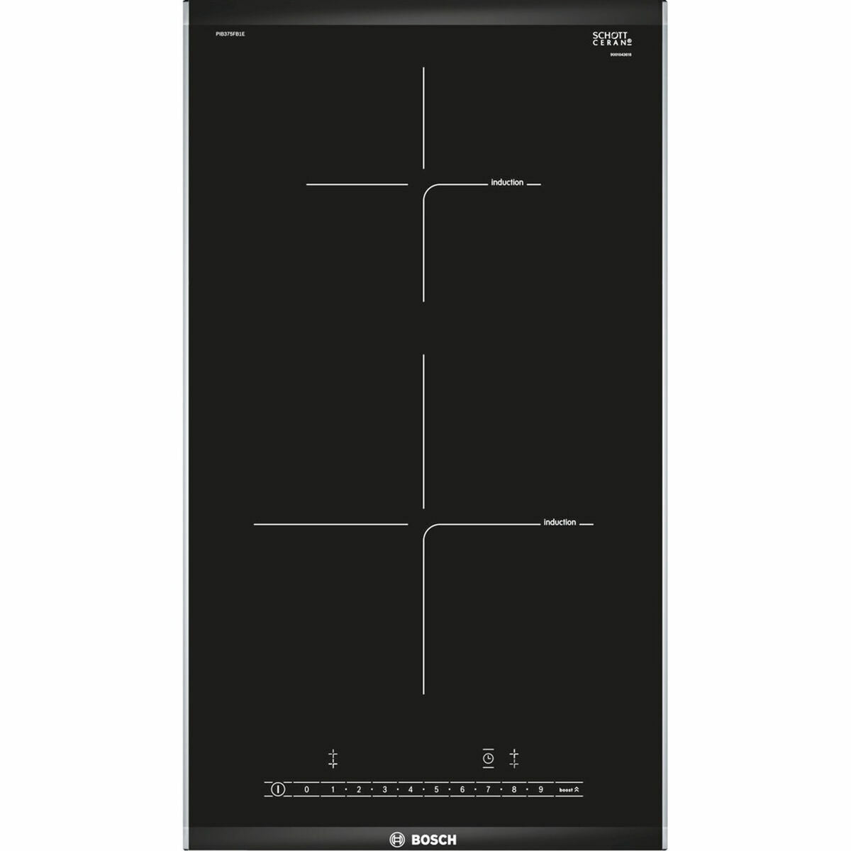 Bosch PIB375FB1E. Couleur du produit: Noir, Acier inoxydable, Placement de l'appareil: Intégré (placement), Type de plaque: Plaque avec zone à induction. Type de commande: Tactile, Position de contrôle: En haut devant. Puissance raccordée (électrique): 3700 W, Tension d'entrée AC: 220-240 V, Fréquence d'entrée AC: 50 - 60 Hz. Largeur: 306 mm, Profondeur: 527 mm, Hauteur: 51 mm