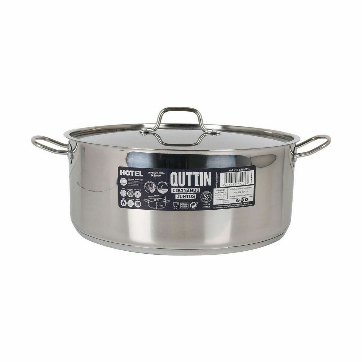 The Hotel saucepan with lid from the brand Quttin is a kitchenware item made of high-resistance steel, ideal for professional and domestic use requiring durability and thermal efficiency. This saucepan has approximate dimensions of ø 34 x 13 cm, offering a generous capacity of 12.5 liters that allows cooking large quantities of food, suitable for stews, broths, or preparations needing space and even cooking. Its wall thickness is 0.8 mm, which helps distribute heat evenly and makes handling easy in the kitchen. The industrial manufacturing combining China and Hong Kong ensures consistent quality and reliability standards. The saucepan with lid is designed as a practical utensil within kitchenware, capable of withstanding intensive use thanks to its robust and functional structure. This piece fits both professional kitchens and home environments that value strength and capacity, facilitating efficient preparation of various recipes. The Quttin Hotel model features a metal construction that helps preserve the flavor and temperature of food, while its lid helps retain moisture and enhance slow or fast cooking as needed. The balance between size, material, and design makes this saucepan a versatile option for those seeking a solid product that meets diverse culinary demands. In summary, the Quttin Hotel saucepan with lid is a reliable and functional solution within kitchenware, suitable for large-volume cooking with quality and durability.