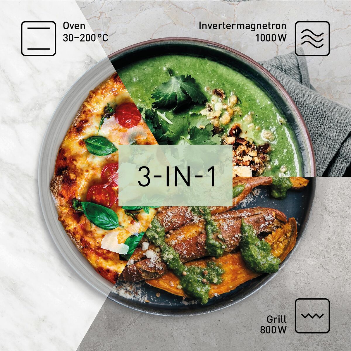 The Panasonic NNDF37PWEPG microwave with grill is designed to offer versatility and efficiency in the kitchen. Equipped with a total power of 1000 W for both microwave and grill functions, it allows cooking and browning food with optimal results. Its 23-liter interior capacity suits families or users who need to prepare medium-sized dishes, making it easy to cook common containers and plates without restrictions. This model features a rotary control type, simplifying the selection of modes and times intuitively. It offers six power levels, enabling precise heat adjustment according to the food type or desired result, including a specific defrost function ideal for quick and safe meal preparation. The built-in display enhances visibility and control of the cooking process, providing greater convenience and transparency in daily use. The white design and freestanding format allow easy integration into any kitchen style without the need for built-in installation, increasing placement flexibility. Additionally, the inclusion of an inverter motor ensures more even heat distribution and lower energy consumption, optimizing cooking times and quality. The grill rack lets you toast and gratin food with professional results, maintaining the simplicity that characterizes this appliance. The microwave operates at a standard 230 V voltage, ensuring compatibility with typical European household electrical systems. Overall, the Panasonic NNDF37PWEPG combines essential functions with modern technology, making it a practical and efficient choice for those seeking a microwave with grill that meets everyday needs without complications.